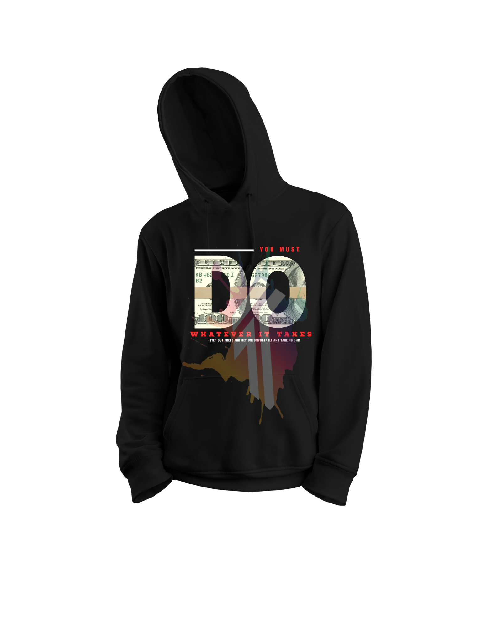 The image showcases a black hoodie with a bold motivational design. The centerpiece features the large text “DO” with a textured overlay of a dollar bill, emphasizing ambition and success. Above the word "DO," in smaller red text, it says “YOU MUST,” and below it, in striking red text, it reads “WHATEVER IT TAKES.”