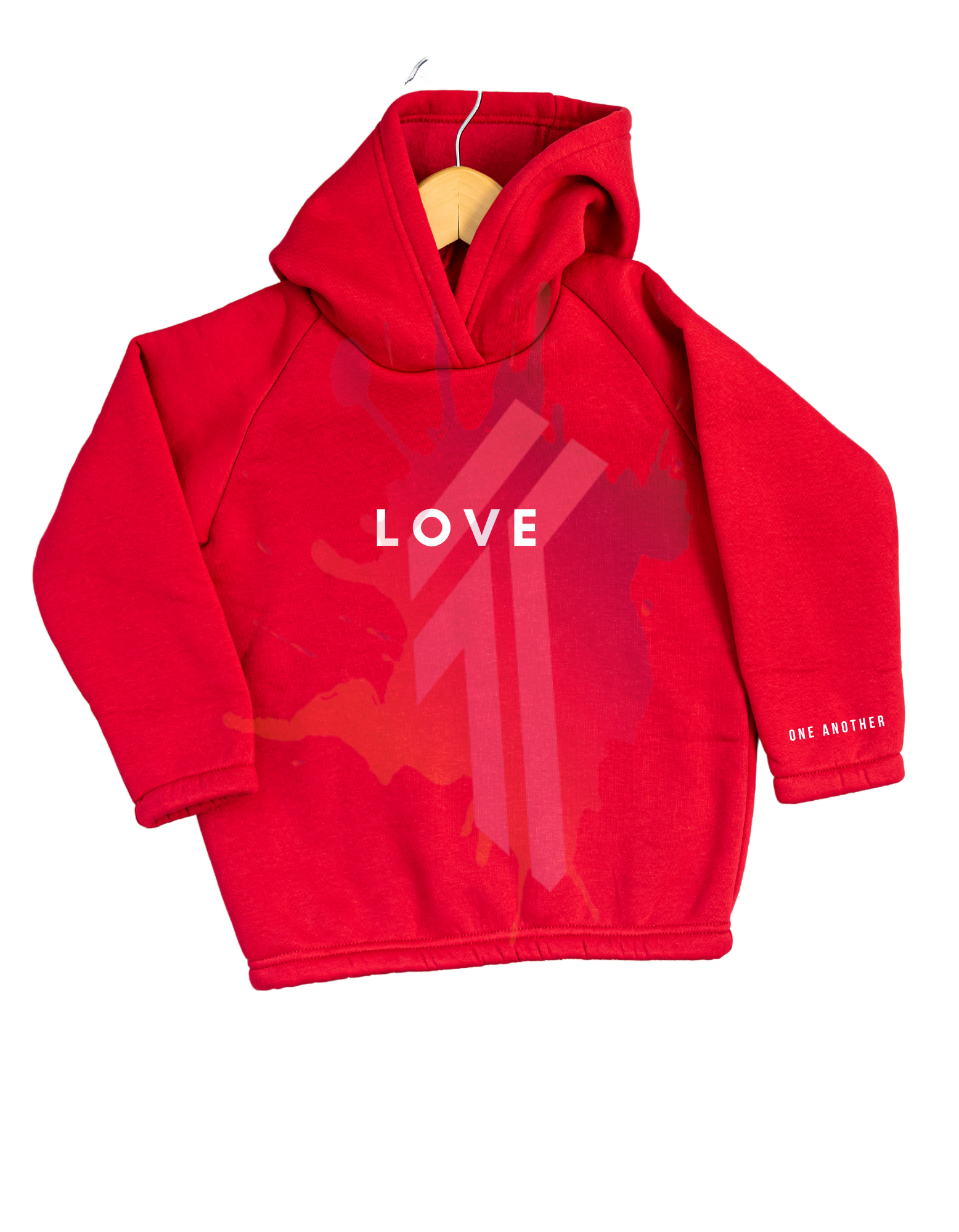 The image shows a vibrant red hoodie with a modern design. On the front, the typography features the word "LOVE" in bold, clean white letters centered across the chest. On the sleeve, near the cuff, the text "ONE ANOTHER" is printed in a small, white, minimalist font. The overall style is contemporary, with a message promoting unity and compassion.