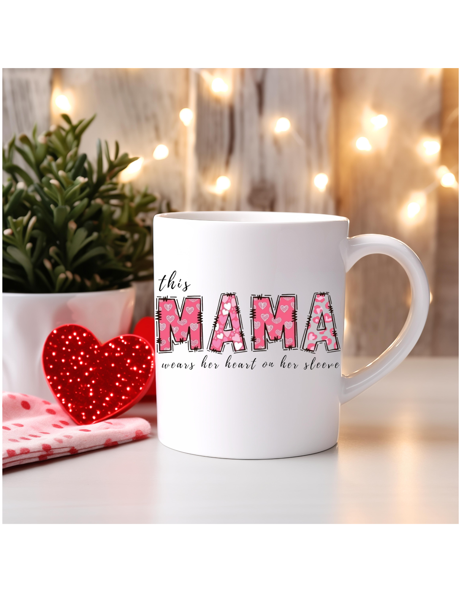 This ceramic coffee mug proudly displays the phrase "This MAMA Wears Her Heart On Her Sleeve" in pink lettering, adorned with pink and white hearts. This mug pairs perfectly with the matching t-shirt and makes a heartfelt gift for an awesome and beloved MAMA.